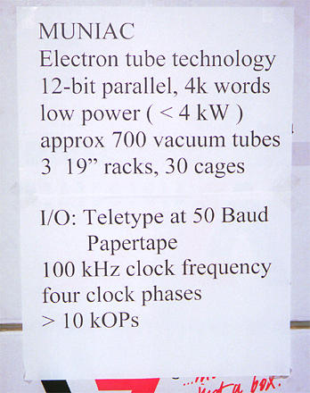 A true surprise and a provocation as well was the John Zabolitzky MUNIAC RÖHRENCOMPUTER MUNIAC, a newly developed vacuum tube computer (a completely original concept, all born of one mind, as a study). John Zabolitzky, the father of this device, had soldered together many of the "Units", as he calls his uniform logic blocs and integrated their functions into the growing computer. "With its 10K Ops (Operations per second!) not exactly a speeder and probably stupid like a hay stack - but beautiful!" thus quoth a visitor, who had appraisingly read the technical data only to continue with a broad smile. A truely astounding fact: someone develops this kind of a computer in the year 2000, one that takes up 19-inch rackmounted packs and always has to fight the 10A power limit not to blow ordinary housing fuses during power-on and power-off!