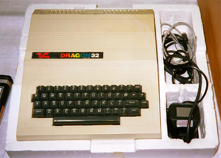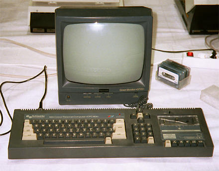 Being nosy by nature, we started to explore our neighbourhood (Gawrsh, it sounds like Windows!). Not a bad one, and quite impressive, even by mere weight and size! There were cupboards from the "stone age" Yes, of course that's a Vax! (VAX 1130 and Co) with huge terminals and external CPU-racks, as well as 8" Winchester drives and, of course, the whole honourable COMMODORE palette, starting with the PET (Personal Electronic Transactor) up to the COMMODORE PLUS 4, was present. The latter were heard uttering quite dishonorable sounds. Not only had they gathered in a small herd, but they rehearsed a strange quire of rarely melodic sequences of beeps (SHOOT-EM UP!). There's not much more to say about this line-up. Despite the fact that the local organiser, Hans Franke, had demanded everyone to fill out a presentation info sheet in German and in English, his own computers (and they were his) could only be identified by their name plates. AMSTRAD/Schneider CPC 464 DRAGON32 (Some of the identification plates on the Commodore computers could only be read by turning the unit upside-down!) In total isolation and left alone, an old friend sat on the table, a (AMSTRAD) Schneider CPC 464, and another veteran of the home computer era, the famous Dragon 32.